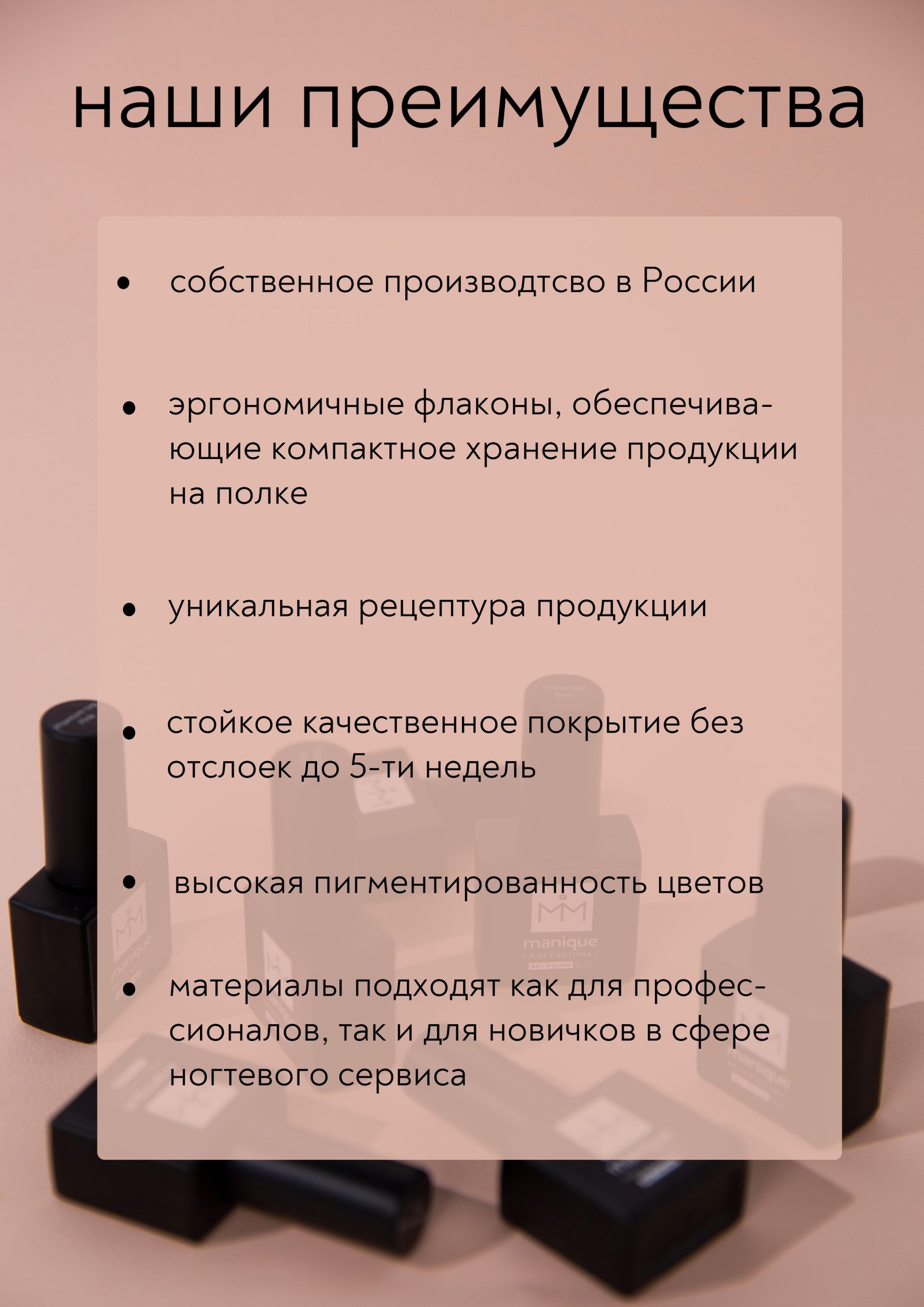 Прозрачное базовое покрытие маник Flex-Si base coat manique средней консистенции, обладает средней кислотностью. Упругая база, легко самовыравнивается при нанесении. Особо прочная база при выравнивании, эластичная база при нанесении тонким слоем. Идеальная основа под гель-лак для мастеров ногтевого сервиса. Подложка под более жесткие материалы (гель, билдер, полигель, акригель, жесткая база). Применение: на подготовленный ноготь наносим базовое покрытие (если ногти тонкие, слоящиеся, наносим подложку тонким слоем, просушиваем, далее наносим базу выравнивающим слоем). Время полной полимеризации – 2 мин. в лампе LED/UV 48 W. Не снимая дисперсионный слой (липкий слой), наносим цветной гель-лак (1-2 слоя). Чтобы завершить маникюр, наносим глянцевый топ для маникюра с покрытием гель-лак (Glass top или Super Gloss top) или топ для дизайна из коллекции Shine. Для снятия гель-лака использовать жидкость (после опиливания верхнего слоя), экспозиция 3-5 мин. Либо снятие происходит фрезой (не доходя до дорсального слоя ногтя). Упругая база маник manique не конфликтует с другими марками гель-лаков.