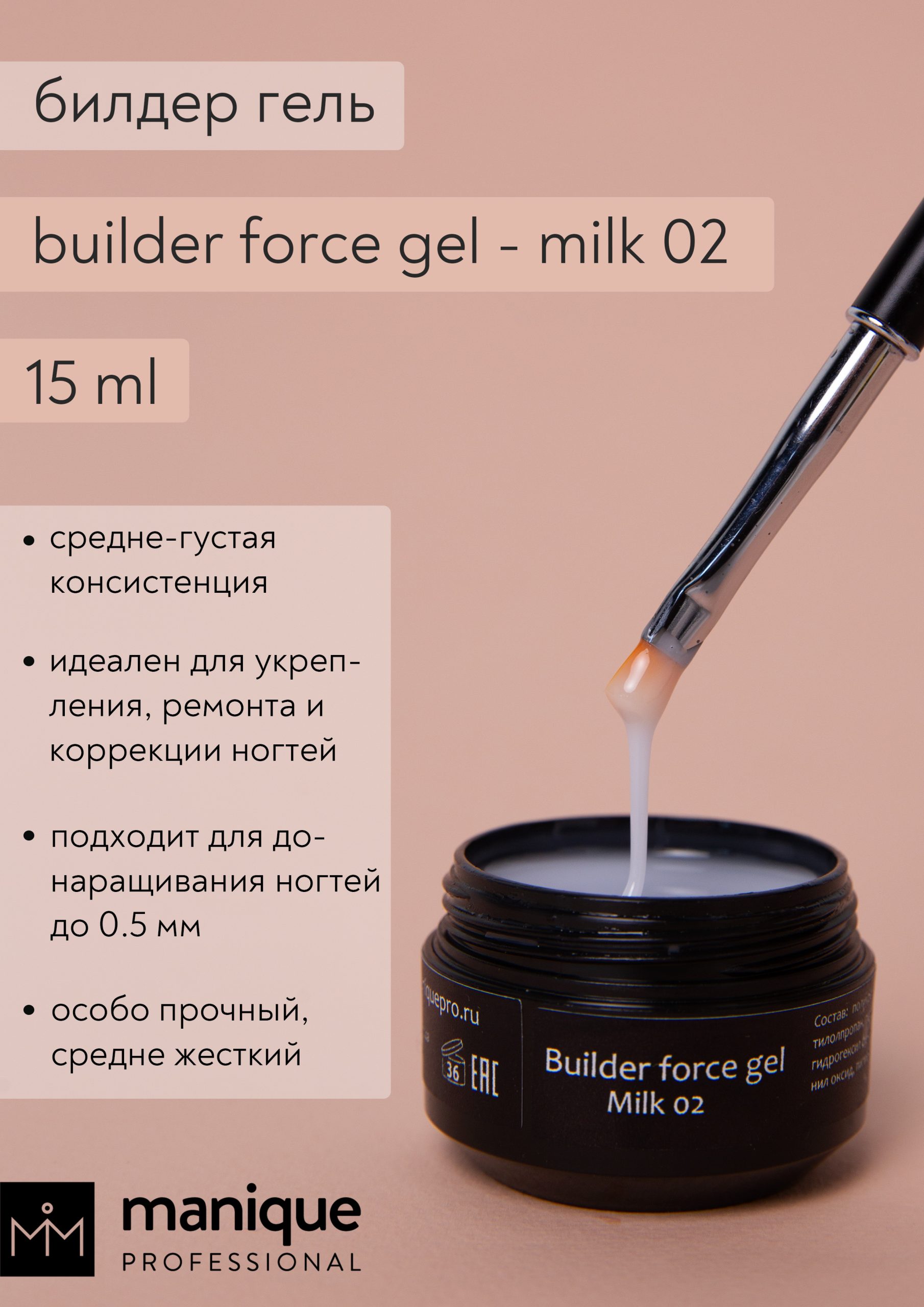 Комуфлирующий молочный билдер гель маник Builder force gel milk 02 manique средне густой консистенции, для укрепления, ремонта, небольшого донаращивания до 0,5 мм, коррекции ногтей. Удобная консистенция, как для новичков, так и для опытных мастеров ногтевого сервиса. Особо прочный средне жесткий билдер гель, легко самовыравнивается при нанесении. Благодаря средне густой консистенции builder gel легко выложить на ногтевом ложе, выстроить архитектуру ногтя, сделать выравнивание без опила.