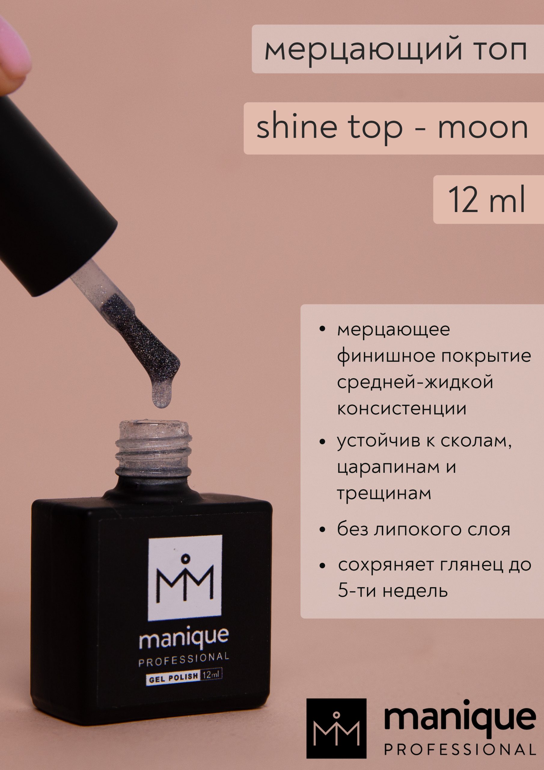 Мерцающее финишное покрытие маник Shine top moon no wipe manique средне жидкой консистенции, устойчиво к мелким царапинам, содержит мелкий галографический шиммер. Содержит УФ-фильтр. Топ без липкого слоя (не требует снятия дисперсионного слоя). Топ с мелкими блестками для дизайна, имеет идеальный финишный глянцевый блеск. Легко самовыравнивается при нанесении. Подходит для завершения маникюра с покрытием гель-лак, гель, билдер, полигель, акригель. Топ для создания идеальных бликов для мастеров ногтевого сервиса. Финишное покрытие топ для французского маникюра. Применение: на подготовленный ноготь наносим базовое покрытие (если ногти тонкие, слоящиеся, наносим подложку тонким слоем, просушиваем, далее наносим базу выравнивающим слоем). Время полной полимеризации – 2 мин. в лампе LED/UV 48 W. Не снимая дисперсионный слой (липкий слой), наносим цветной гель-лак (1-2 слоя). Чтобы завершить маникюр, наносим глянцевый топ для маникюра с покрытием гель-лак (Glass top или Super Gloss top) или топ для дизайна из коллекции Shine. Для снятия гель-лака использовать жидкость (после опиливания верхнего слоя), экспозиция 3-5 мин. Либо снятие происходит фрезой (не доходя до дорсального слоя ногтя). Мерцающий топ маник manique не конфликтует с другими марками гель-лаков.