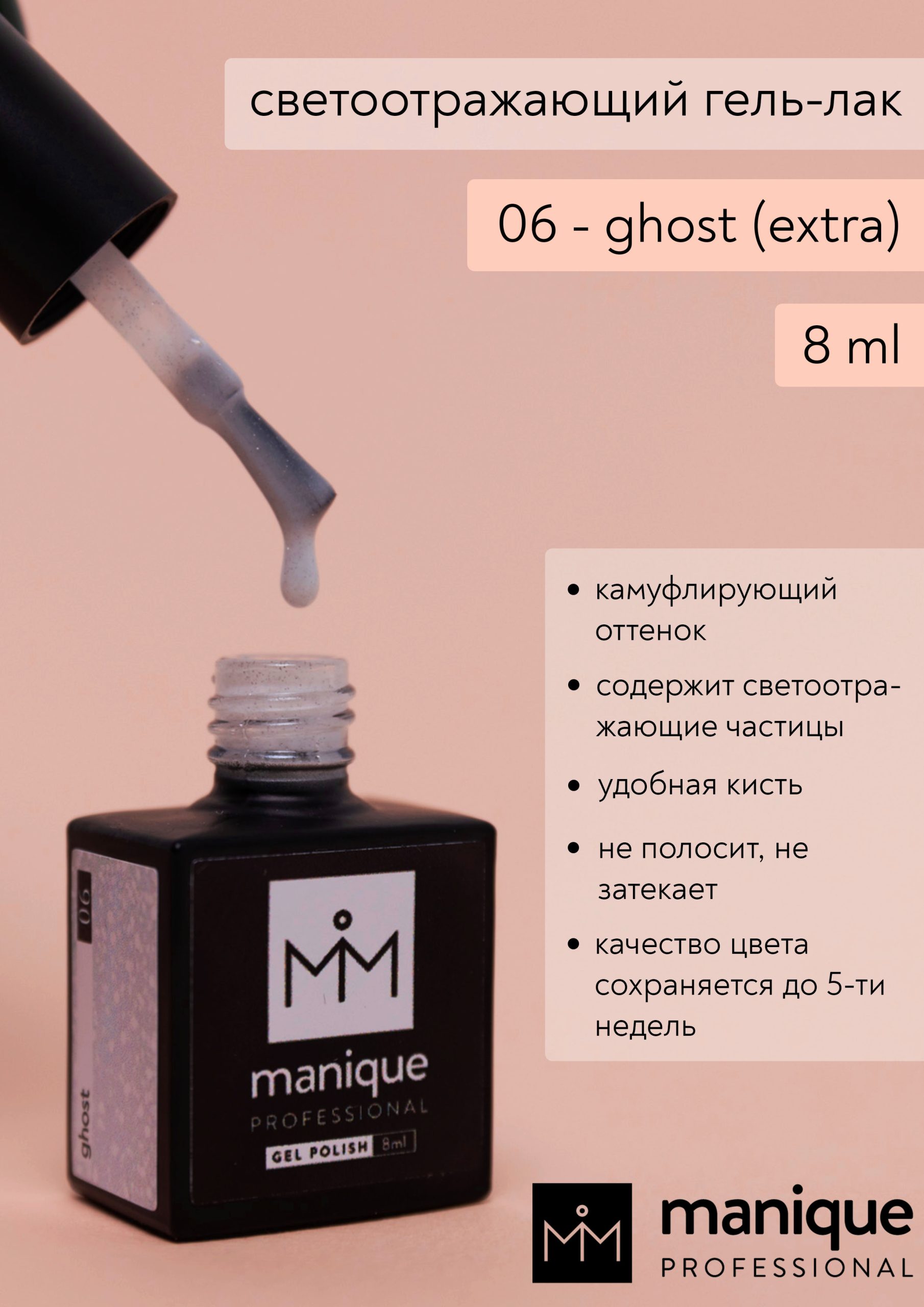 Цветной гель-лак manique (маник) камуфлирующей консистенции. Цвет Ghost 06, белый, светоотражающий. Коллекция extra. Высокая пигментация цвета позволяет наносить многие оттенки в один слой, что значительно сокращает время работы мастера ногтевого сервиса, а так же снижает затраты на расходный материал. Перед применением цветной гель-лак рекомендуем взболтать, зажав флакон между ладонями перекатыванием, для того, чтобы произошло равномерное распределение пигмента в материале. При нанесении гель лак не полосит, не скатывается с базового покрытия. «Умная палитра» позволяет мастерам с любым опытом создавать свою уникальную коллекцию и удивлять клиентов. Качество цвета сохраняется от 3 до 5 недель. Материал не содержит вредных веществ, отсутствует едкий запах. Удобная кисть обеспечивает легкость и комфорт в нанесении материала.