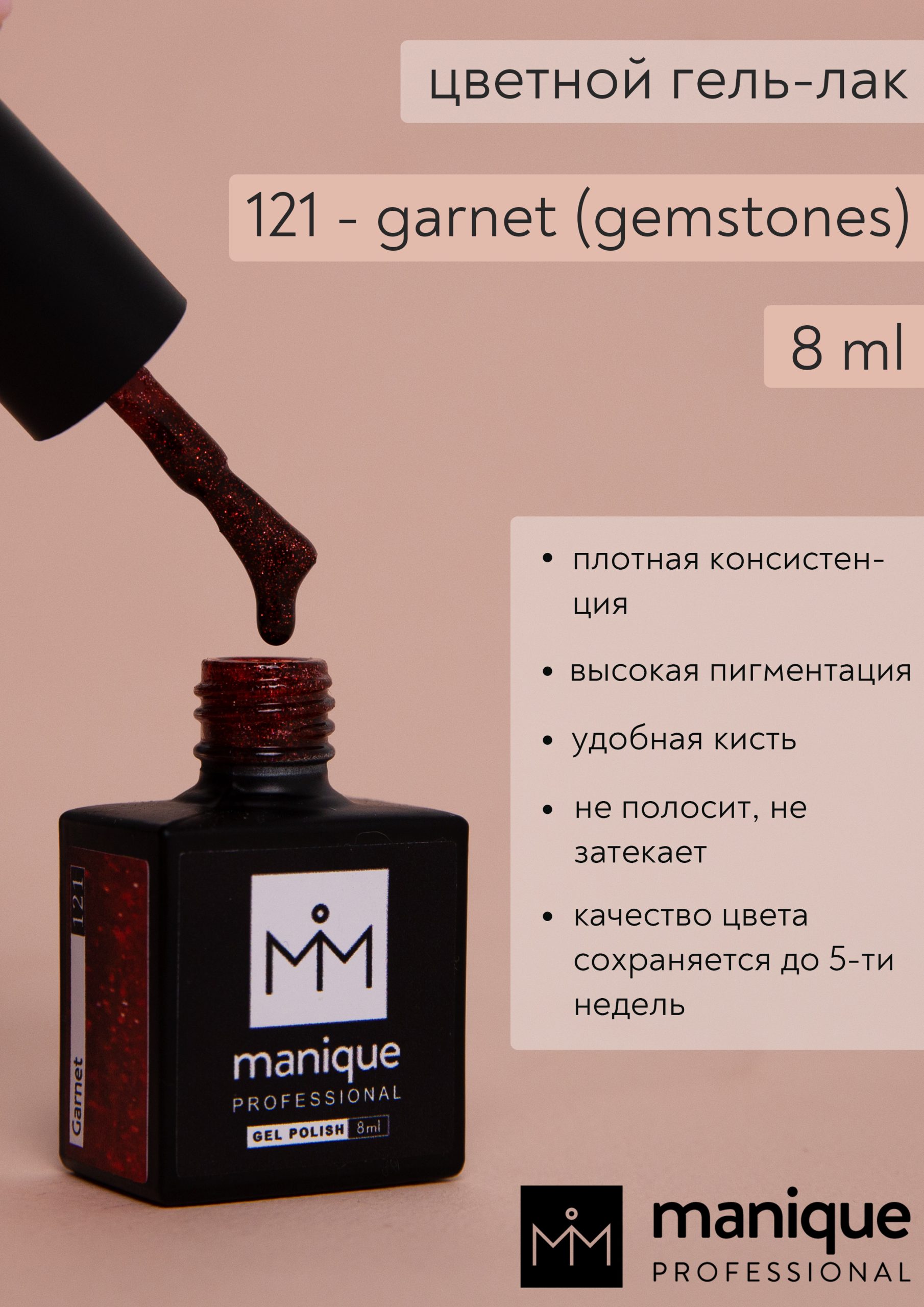 Цветной гель-лак manique (маник) плотной консистенции. Цвет Garnet 121, красный с блестками. Коллекция gemstones. Высокая пигментация цвета позволяет наносить многие оттенки в один слой, что значительно сокращает время работы мастера ногтевого сервиса, а так же снижает затраты на расходный материал. Перед применением цветной гель-лак рекомендуем взболтать, зажав флакон между ладонями перекатыванием, для того, чтобы произошло равномерное распределение пигмента в материале. При нанесении гель лак не полосит, не скатывается с базового покрытия. «Умная палитра» позволяет мастерам с любым опытом создавать свою уникальную коллекцию и удивлять клиентов. Качество цвета сохраняется от 3 до 5 недель. Материал не содержит вредных веществ, отсутствует едкий запах. Удобная кисть обеспечивает легкость и комфорт в нанесении материала. Применение: на подготовленный ноготь наносим базовое покрытие (если ногти тонкие, слоящиеся, наносим подложку тонким слоем, просушиваем, далее наносим базу выравнивающим слоем). Время полной полимеризации – 2 мин. в лампе LED/UV 48 W. Не снимая дисперсионный слой (липкий слой), наносим цветной гель-лак (1-2 слоя). Чтобы завершить маникюр, наносим глянцевый топ для маникюра с покрытием гель-лак (Glass top или Super Gloss top) или топ для дизайна из коллекции Shine. При нарушении технологии нанесения возможно непросыхание гель-лака и впоследствии отслаивание от базового покрытия. Для снятия гель-лака использовать жидкость (после опиливания верхнего слоя), экспозиция 3-5 мин. Либо снятие происходит фрезой (не доходя до дорсального слоя ногтя). Гель лак маник manique не конфликтует с другими марками гель-лаков. ВНИМАНИЕ! Выбранный оттенок может не передавать точного цвета из-за настроек экрана пользователя.