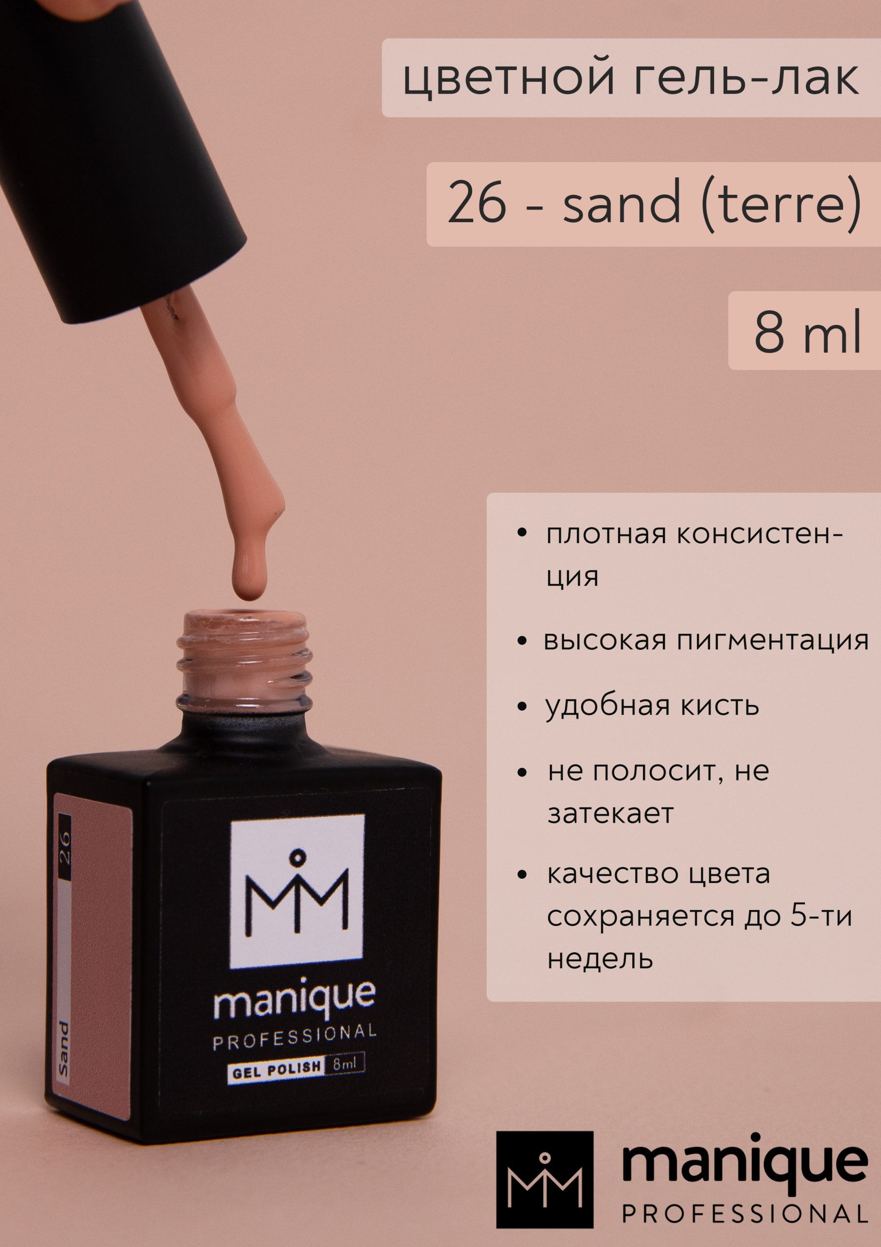 Цветной гель-лак manique (маник) плотной консистенции. Цвет Sand 26, песочный. Коллекция terre. Высокая пигментация цвета позволяет наносить многие оттенки в один слой, что значительно сокращает время работы мастера ногтевого сервиса, а так же снижает затраты на расходный материал. Перед применением цветной гель-лак рекомендуем взболтать, зажав флакон между ладонями перекатыванием, для того, чтобы произошло равномерное распределение пигмента в материале. При нанесении гель лак не полосит, не скатывается с базового покрытия. «Умная палитра» позволяет мастерам с любым опытом создавать свою уникальную коллекцию и удивлять клиентов. Качество цвета сохраняется от 3 до 5 недель. Материал не содержит вредных веществ, отсутствует едкий запах. Удобная кисть обеспечивает легкость и комфорт в нанесении материала. Применение: на подготовленный ноготь наносим базовое покрытие (если ногти тонкие, слоящиеся, наносим подложку тонким слоем, просушиваем, далее наносим базу выравнивающим слоем). Время полной полимеризации – 2 мин. в лампе LED/UV 48 W. Не снимая дисперсионный слой (липкий слой), наносим цветной гель-лак (1-2 слоя). Чтобы завершить маникюр, наносим глянцевый топ для маникюра с покрытием гель-лак (Glass top или Super Gloss top) или топ для дизайна из коллекции Shine. При нарушении технологии нанесения возможно непросыхание гель-лака и впоследствии отслаивание от базового покрытия. Для снятия гель-лака использовать жидкость (после опиливания верхнего слоя), экспозиция 3-5 мин. Либо снятие происходит фрезой (не доходя до дорсального слоя ногтя). Гель лак маник manique не конфликтует с другими марками гель-лаков. ВНИМАНИЕ! Выбранный оттенок может не передавать точного цвета из-за настроек экрана пользователя.