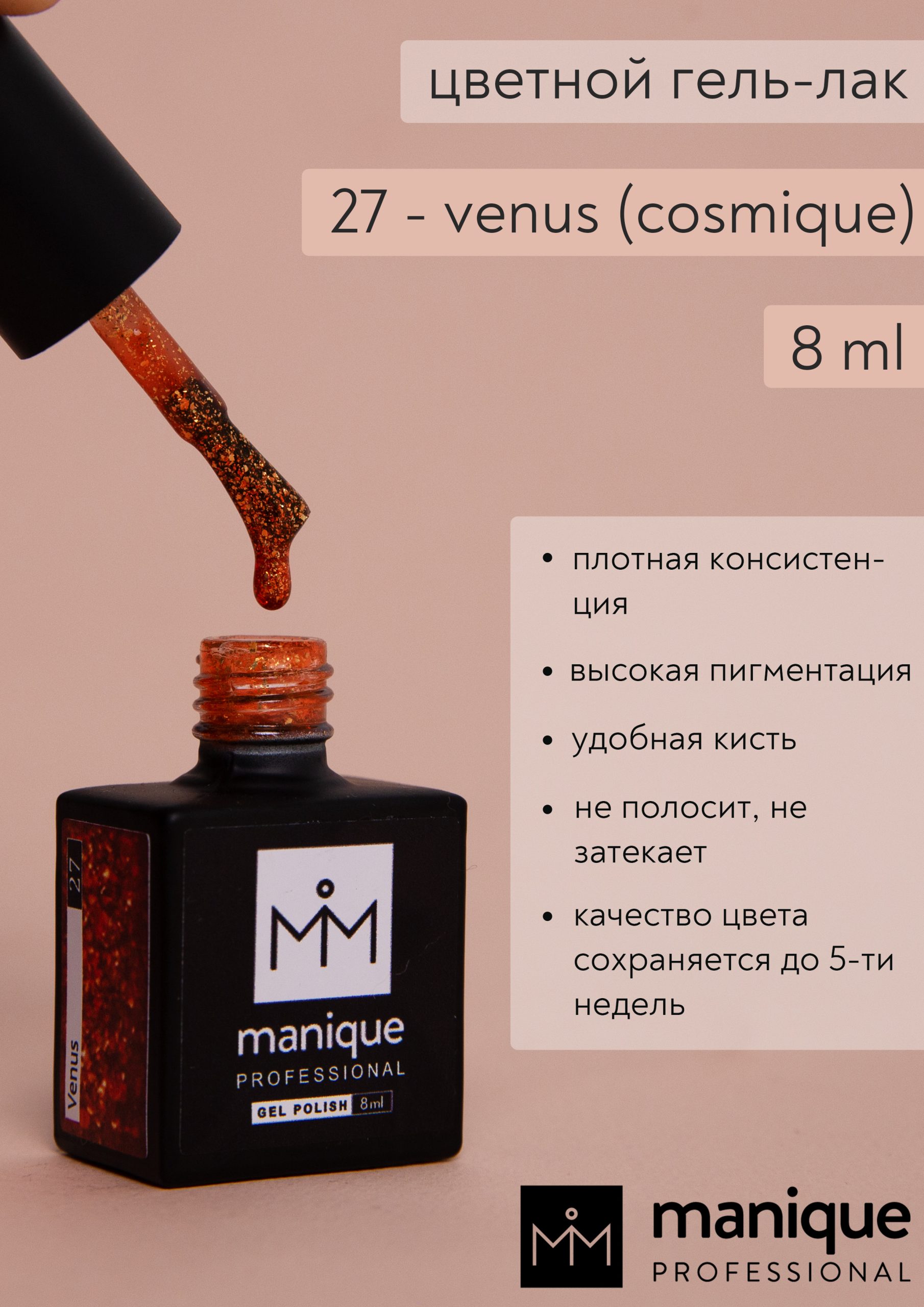 Цветной гель-лак manique (маник) плотной консистенции. Цвет Venus 27, оранжевый с блестками. Коллекция cosmique. Высокая пигментация цвета позволяет наносить многие оттенки в один слой, что значительно сокращает время работы мастера ногтевого сервиса, а так же снижает затраты на расходный материал. Перед применением цветной гель-лак рекомендуем взболтать, зажав флакон между ладонями перекатыванием, для того, чтобы произошло равномерное распределение пигмента в материале. При нанесении гель лак не полосит, не скатывается с базового покрытия. «Умная палитра» позволяет мастерам с любым опытом создавать свою уникальную коллекцию и удивлять клиентов. Качество цвета сохраняется от 3 до 5 недель. Материал не содержит вредных веществ, отсутствует едкий запах. Удобная кисть обеспечивает легкость и комфорт в нанесении материала. Применение: на подготовленный ноготь наносим базовое покрытие (если ногти тонкие, слоящиеся, наносим подложку тонким слоем, просушиваем, далее наносим базу выравнивающим слоем). Время полной полимеризации – 2 мин. в лампе LED/UV 48 W. Не снимая дисперсионный слой (липкий слой), наносим цветной гель-лак (1-2 слоя). Чтобы завершить маникюр, наносим глянцевый топ для маникюра с покрытием гель-лак (Glass top или Super Gloss top) или топ для дизайна из коллекции Shine. При нарушении технологии нанесения возможно непросыхание гель-лака и впоследствии отслаивание от базового покрытия. Для снятия гель-лака использовать жидкость (после опиливания верхнего слоя), экспозиция 3-5 мин. Либо снятие происходит фрезой (не доходя до дорсального слоя ногтя). Гель лак маник manique не конфликтует с другими марками гель-лаков. ВНИМАНИЕ! Выбранный оттенок может не передавать точного цвета из-за настроек экрана пользователя.
