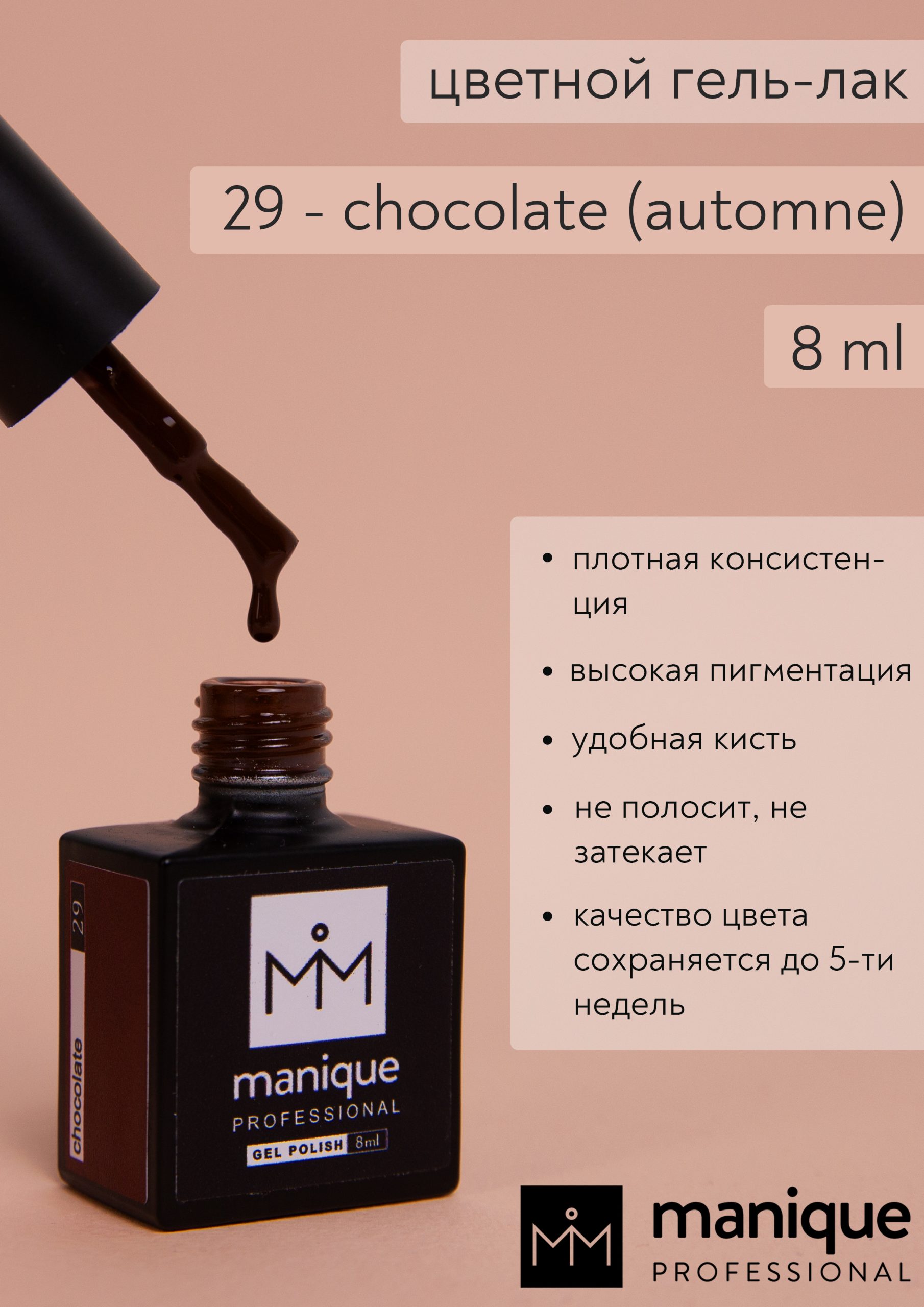 Цветной гель-лак manique (маник) плотной консистенции. Цвет chocolate 29, коричневый шоколадный. Коллекция automne. Высокая пигментация цвета позволяет наносить многие оттенки в один слой, что значительно сокращает время работы мастера ногтевого сервиса, а так же снижает затраты на расходный материал. Перед применением цветной гель-лак рекомендуем взболтать, зажав флакон между ладонями перекатыванием, для того, чтобы произошло равномерное распределение пигмента в материале. При нанесении гель лак не полосит, не скатывается с базового покрытия. «Умная палитра» позволяет мастерам с любым опытом создавать свою уникальную коллекцию и удивлять клиентов. Качество цвета сохраняется от 3 до 5 недель. Материал не содержит вредных веществ, отсутствует едкий запах. Удобная кисть обеспечивает легкость и комфорт в нанесении материала. Применение: на подготовленный ноготь наносим базовое покрытие (если ногти тонкие, слоящиеся, наносим подложку тонким слоем, просушиваем, далее наносим базу выравнивающим слоем). Время полной полимеризации – 2 мин. в лампе LED/UV 48 W. Не снимая дисперсионный слой (липкий слой), наносим цветной гель-лак (1-2 слоя). Чтобы завершить маникюр, наносим глянцевый топ для маникюра с покрытием гель-лак (Glass top или Super Gloss top) или топ для дизайна из коллекции Shine. При нарушении технологии нанесения возможно непросыхание гель-лака и впоследствии отслаивание от базового покрытия. Для снятия гель-лака использовать жидкость (после опиливания верхнего слоя), экспозиция 3-5 мин. Либо снятие происходит фрезой (не доходя до дорсального слоя ногтя). Гель лак маник manique не конфликтует с другими марками гель-лаков. ВНИМАНИЕ! Выбранный оттенок может не передавать точного цвета из-за настроек экрана пользователя.