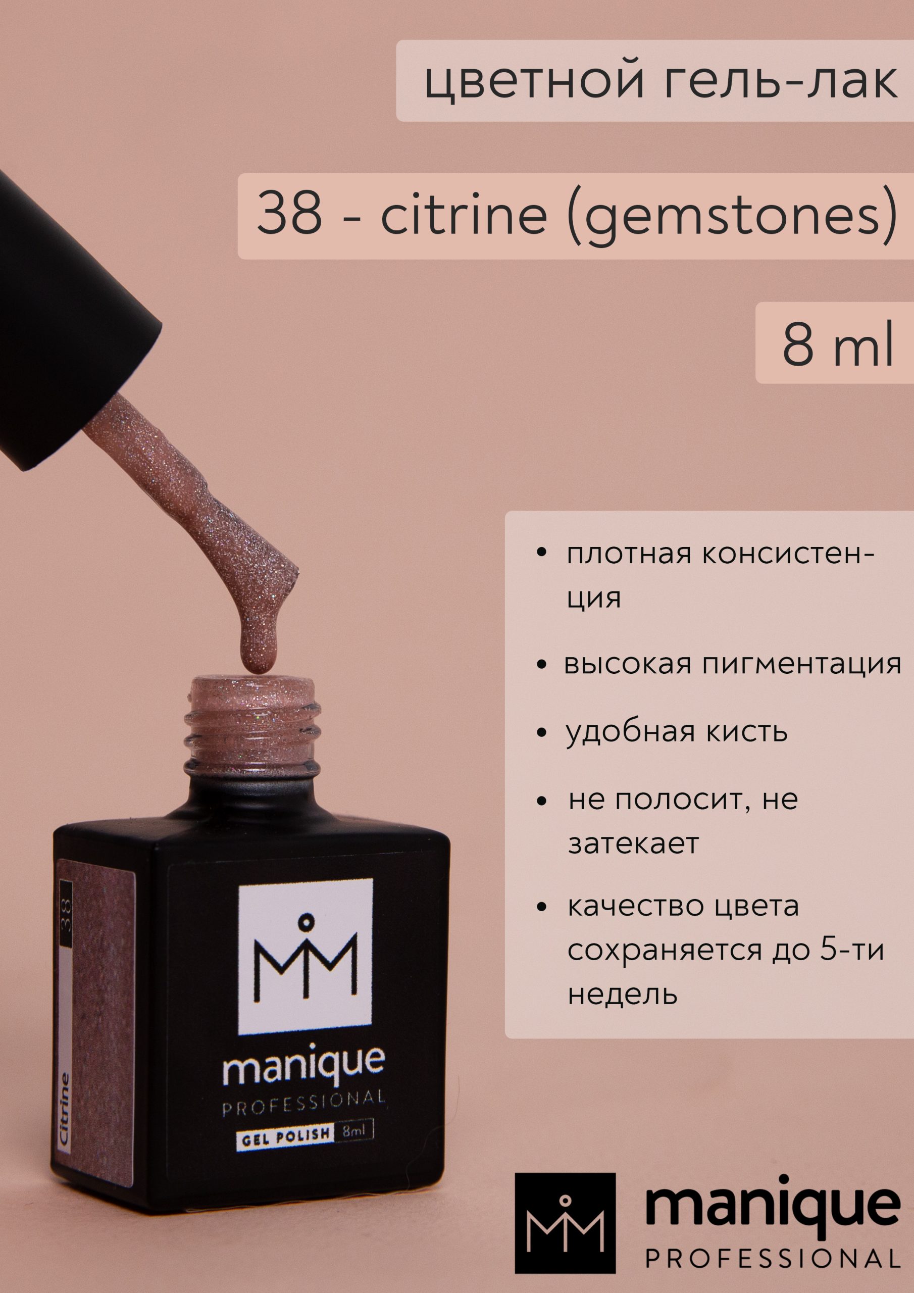 Цветной гель-лак manique (маник) плотной консистенции. Цвет Citrine 38, бежевый с блестками. Коллекция gemstones. Высокая пигментация цвета позволяет наносить многие оттенки в один слой, что значительно сокращает время работы мастера ногтевого сервиса, а так же снижает затраты на расходный материал. Перед применением цветной гель-лак рекомендуем взболтать, зажав флакон между ладонями перекатыванием, для того, чтобы произошло равномерное распределение пигмента в материале. При нанесении гель лак не полосит, не скатывается с базового покрытия. «Умная палитра» позволяет мастерам с любым опытом создавать свою уникальную коллекцию и удивлять клиентов. Качество цвета сохраняется от 3 до 5 недель. Материал не содержит вредных веществ, отсутствует едкий запах. Удобная кисть обеспечивает легкость и комфорт в нанесении материала. Применение: на подготовленный ноготь наносим базовое покрытие (если ногти тонкие, слоящиеся, наносим подложку тонким слоем, просушиваем, далее наносим базу выравнивающим слоем). Время полной полимеризации – 2 мин. в лампе LED/UV 48 W. Не снимая дисперсионный слой (липкий слой), наносим цветной гель-лак (1-2 слоя). Чтобы завершить маникюр, наносим глянцевый топ для маникюра с покрытием гель-лак (Glass top или Super Gloss top) или топ для дизайна из коллекции Shine. При нарушении технологии нанесения возможно непросыхание гель-лака и впоследствии отслаивание от базового покрытия. Для снятия гель-лака использовать жидкость (после опиливания верхнего слоя), экспозиция 3-5 мин. Либо снятие происходит фрезой (не доходя до дорсального слоя ногтя). Гель лак маник manique не конфликтует с другими марками гель-лаков. ВНИМАНИЕ! Выбранный оттенок может не передавать точного цвета из-за настроек экрана пользователя.